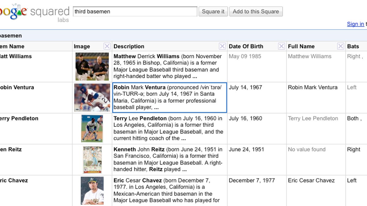 Likewise, Google Squared suggested "Batting Average" as an additional category, but failed to return any results. That's a statistic that can be easily found on the Web for any player, living or dead, with a regular Google search.