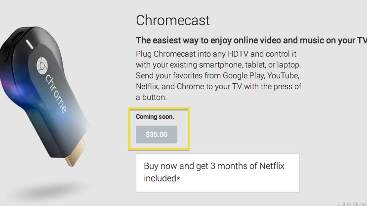 The $35 dongle, which plugs into the HDMI port of televisions and lets users stream content from multiple device platforms, is now listed as "coming soon" with no option to order it from Google's online store. Shortly after sales went up, it was listed to ship between August 2 and August 7, down from the 1-2 days for initial orders.