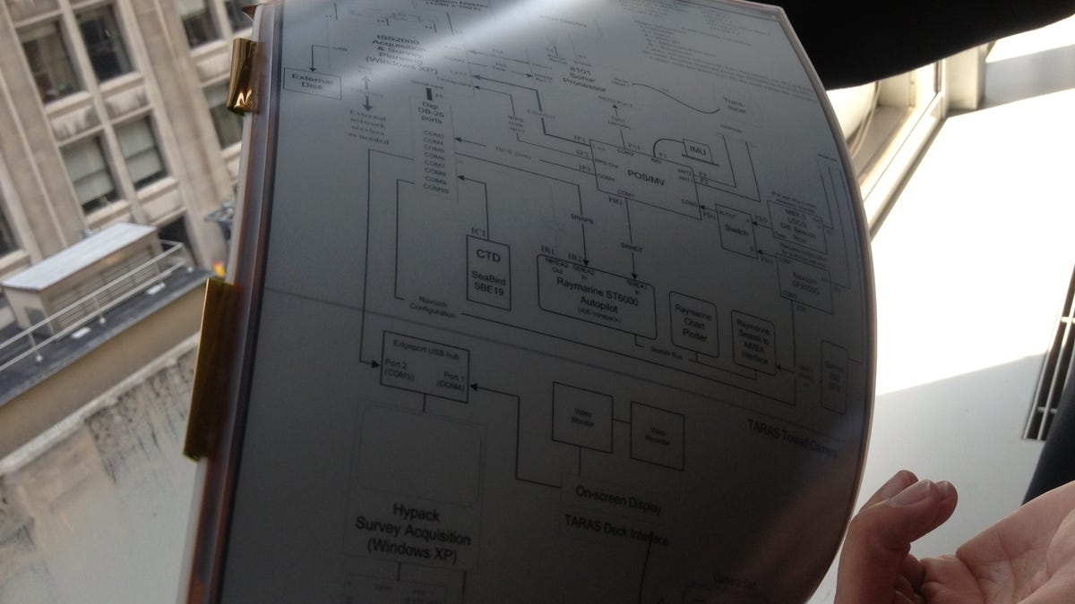The key to flexible display technology is how light it is. Since it's plastic -- as opposed to glass -- it's obviously lighter, and you don't have to worry about the screen cracking (the protection layer can be thinner and lighter as a result). Mancini said the total weight of Sony's large-format e-reader is around 350 grams, or just over 12 ounces. The Kindle Paperwhite weighs 213 grams or 7.5 ounces. And the 9.7-inch (diagonal) Kindle DX, which Amazon recently began selling again, weighs in at 19.2 ounces. The smaller Kindle DX's screen measures 5.4x7.9 inches.