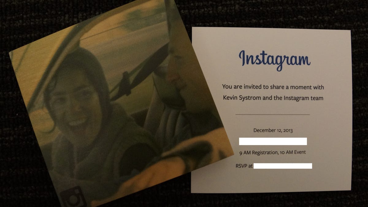 Last week, CNET received a mysterious invite -- sent via FedEx, not e-mail -- for an event to "share a moment with Kevin Systrom and the Instagram team." The package, wrapped with brown paper and a white ribbon, contained a wooden block, 4 inches long and wide and 1.75 inches thick, covered with a printed Instagram shot and a slot in the back so it can be hung on the wall.