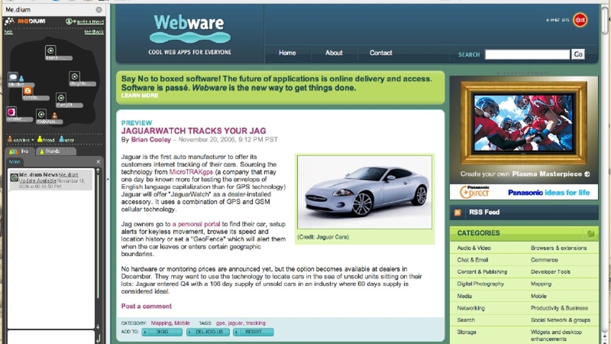 Last week, as I recounted yesterday, I went to the TechCrunch NYC meetup and was consequently barraged by all kinds of Web 2.0 esoterica. Some were not-so-innovative (do we really need more social bookmarking and link annotation sites?) and others were pretty darn cool. In the "pretty darn cool" category lies Me.dium, a Firefox extension that aims to let you visualize traffic on the Web as though you were "walking down Main Street," according to co-founder David Mandell. It takes the form of a sidebar on your browser (see screengrab at left) and shows you a "cloud" of Me.dium users who are hanging out on similar pages. There are some social functions, like starting chats and building a "friends list," too.