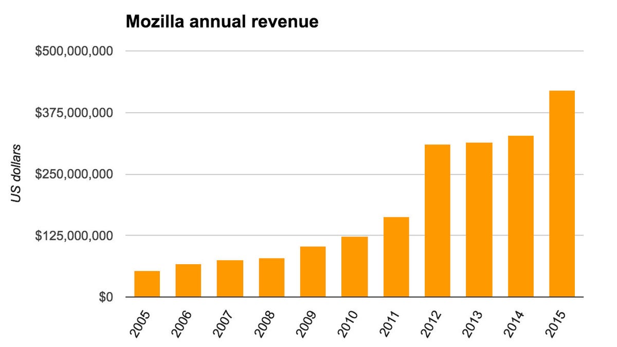 Mozilla revenue, chiefly from search-engine partners, continues to grow. It reached $421 million in 2015.