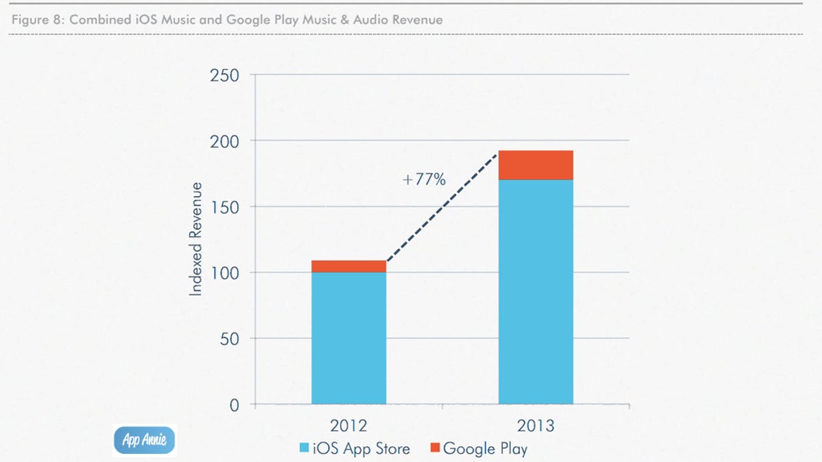 App Annie, an analytics company that monitors app rankings, found music app revenue jumped 77 percent last year from 2012, in a review of app data. The category moved up to the third most popular type of app last year, after being ranked seventh in 2012. Social networking apps moved up the same number of steps in the rankings to the No. 2 spot, with games continuing to dominate the chart.