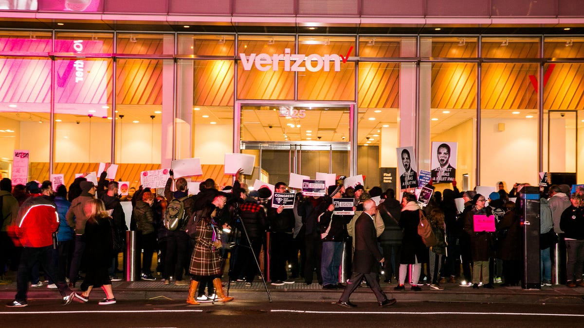 Protesters gathered outside a Verizon store in New York City in an effort to stop the FCC from repealing net neutrality protections.