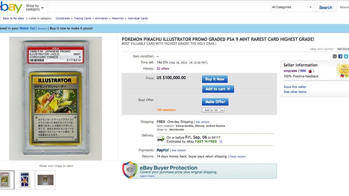 While eBay user Scott Pratte -- a prolific seller whose two card-collecting passions include Pokemon and hockey -- is aware that his item won't likely fetch that enormous amount, he's already received a legitimate offer of $47,000. He expects to see that amount climb at least a little higher in the remaining 13 days of his auction.