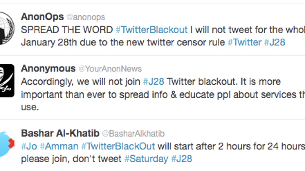 Some Twitter users are trying to wield the organizing power of the social-networking site against the site itself: they're using the hashtags #TwitterBlackout, #TwitterCensored, and #J28 to spread news of a Twitter boycott planned for tomorrow.
