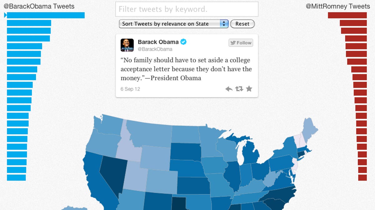 "We've built a visualization that illustrates people's reaction to and engagement by state to tweets from @MittRomney and @BarackObama," Miguel Rios of Twitter's analytics team wrote in a blog post. "While the Twitter Political Index analyzes Tweets about the candidates, [we've] also been studying how citizens interact with tweets from the candidates. We... want to see what insights you can glean from Twitter data, so this visualization is fully interactive."