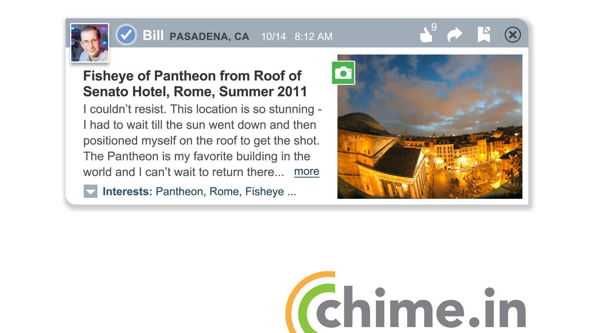 As Gross sees it, the only hurdles today's social networks face are relevance and monetization. Not surprisingly, his latest social offering, dubbed Chime.in, is an effort to address both issues. Chime.in will formally launch today at 11:05 a.m. PST--timed to coincide with a live demo by Bill Gross himself at the Web 2.0 Summit in San Francisco.