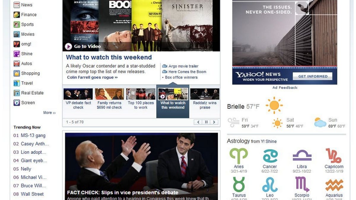 The story notes some of the changes include a search bar that's now centered and is part of a darker toolbar that scrolls down the page, as well as separate boxes for local weather and astrology. Another change is fewer links to Yahoo sites on the left side, with Dating, Flickr, Games and others now apparently dropped from the list.Yahoo won't confirm any of these changes, so we'll see what, if anything, emerges.