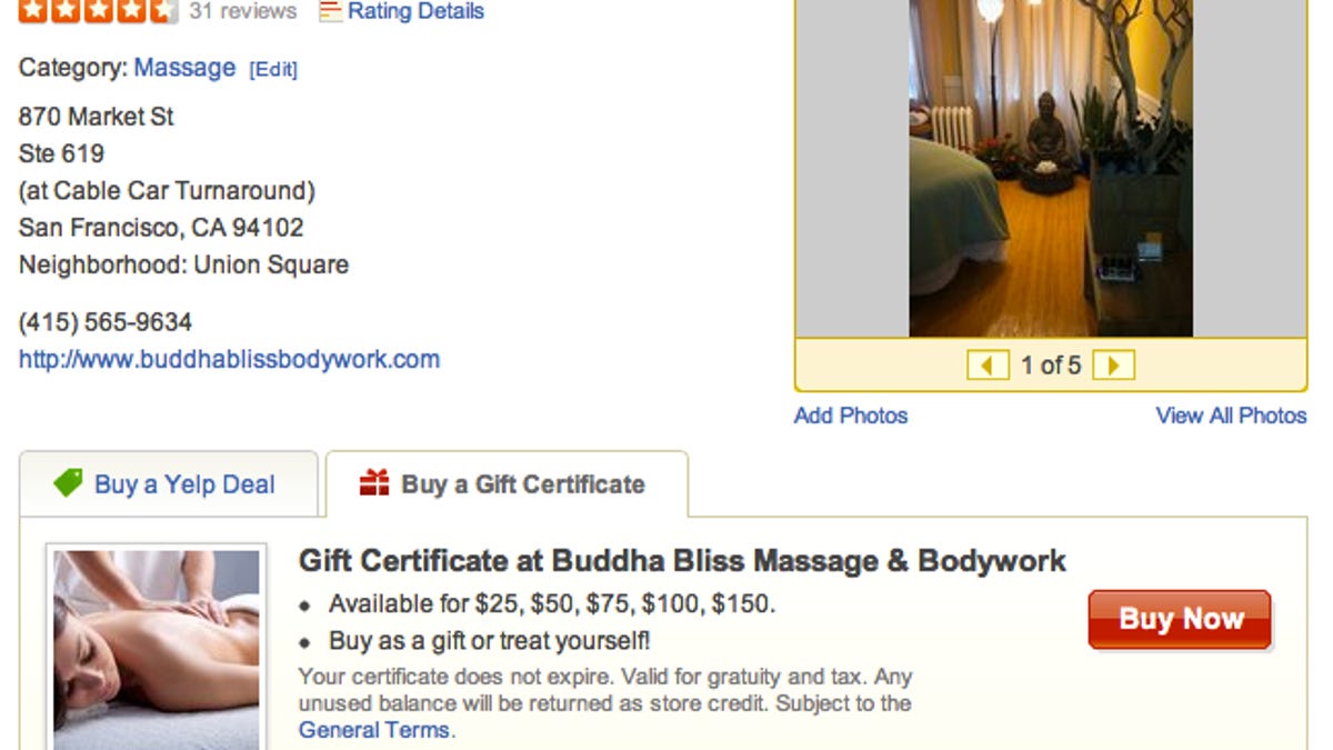 Gift certificates are not discounted like Deals are. They're full-value cash equivalents. For example: I buy you a $100 gift certificate to the hottest restaurant in town (for your 40th birthday, poor thing), it costs me $100 (and is worth every cent), and is valid for $100 worth of drink and food (in that order) at said eatery. Easy, right?Yelp rolled out Yelp Deals a year ago, which is similar to the Groupon model. But Groupon has yet to offer a gift certificate program like what Yelp launched today. This could increase competition between the two companies, especially since Yelp already has built-in relationships with local business and a loyal user base.