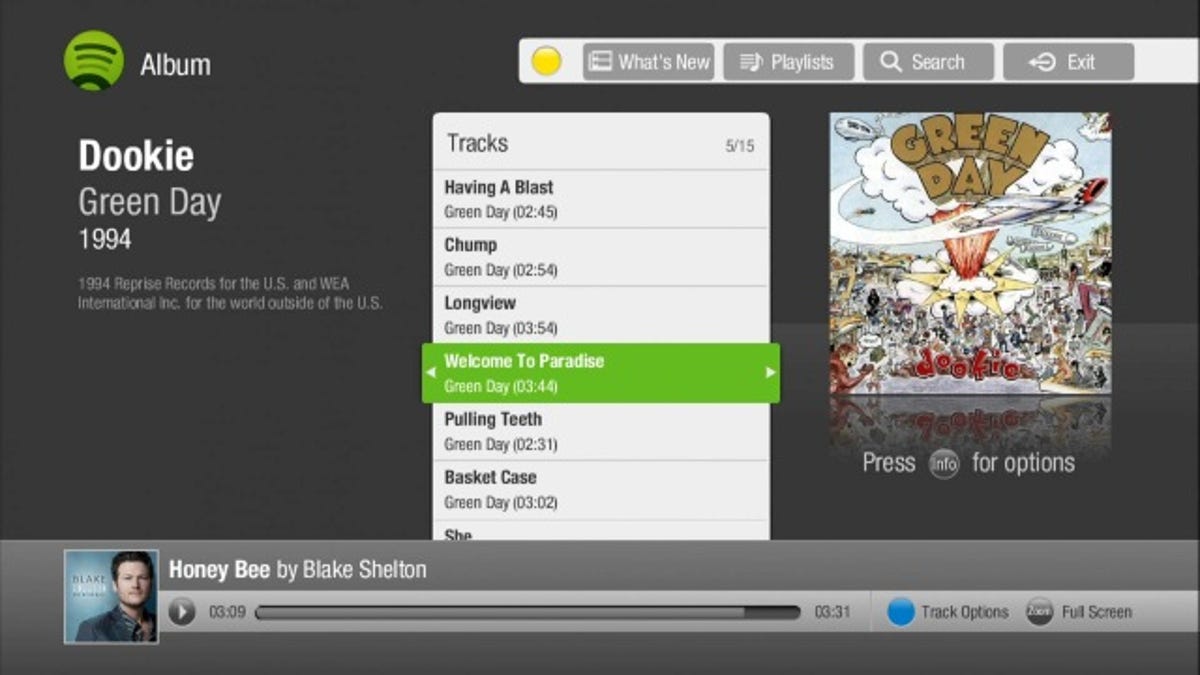 TiVo users can sign in with an existing Spotify Premium account ($9.99/month) to stream music through their home theater system (or TV), as well as browse playlists, albums and artists, and search using the TiVo remote control.