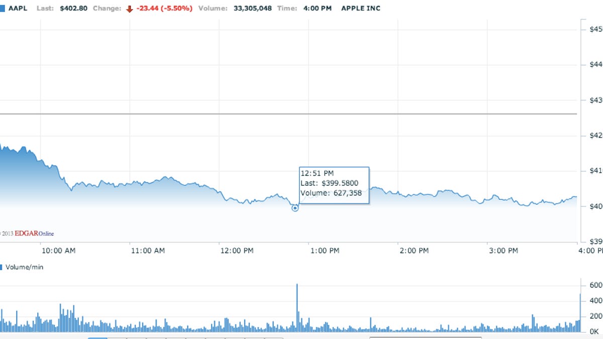 After climbing to more than $700 eight months ago, Apple's shares continued their steep decline on Wednesday. After falling below $400 for the first time since 2011, the shares closed at $402.80, down $23.44, or 5.5 percent.