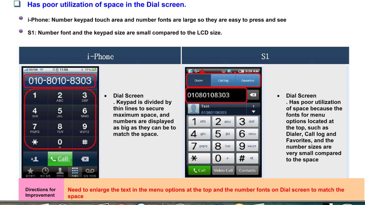 According to the report, Samsung found 27 items under basic function that fell short against the iPhone, including the efficient and effective use of the screen real estate. It also found 22 items under visual interaction effects, such as the effect for saving mail and screen transitions, and noted that the Galaxy S1 had fewer effects aside from the major menus. Other categories included browsing, messaging and multimedia, with various deficiencies listed.