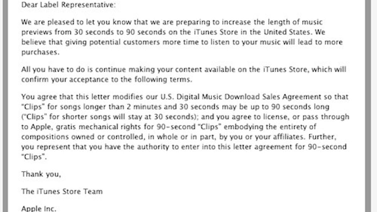 An Apple spokesman confirmed for CNET this evening a report by Symphonic Distribution, a digital music distributor, that iTunes would soon be extending the length of song samples from 30 seconds to 90 seconds for songs that are at least two-and-a-half minutes in length. Shorter songs would continue to offer the 30-second sample.
