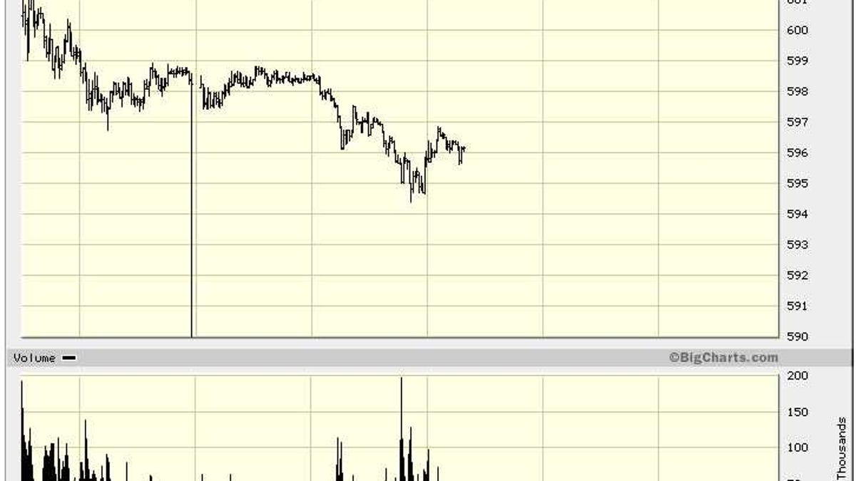 Roughly 10 minutes later, at 10:57:36 a.m. ET, a single trade of 100 AAPL shares on the BATS exchange instantly pushed the stock down to $542.80. That's when the circuit breakers did their duty. The system worked. (Sorta.)