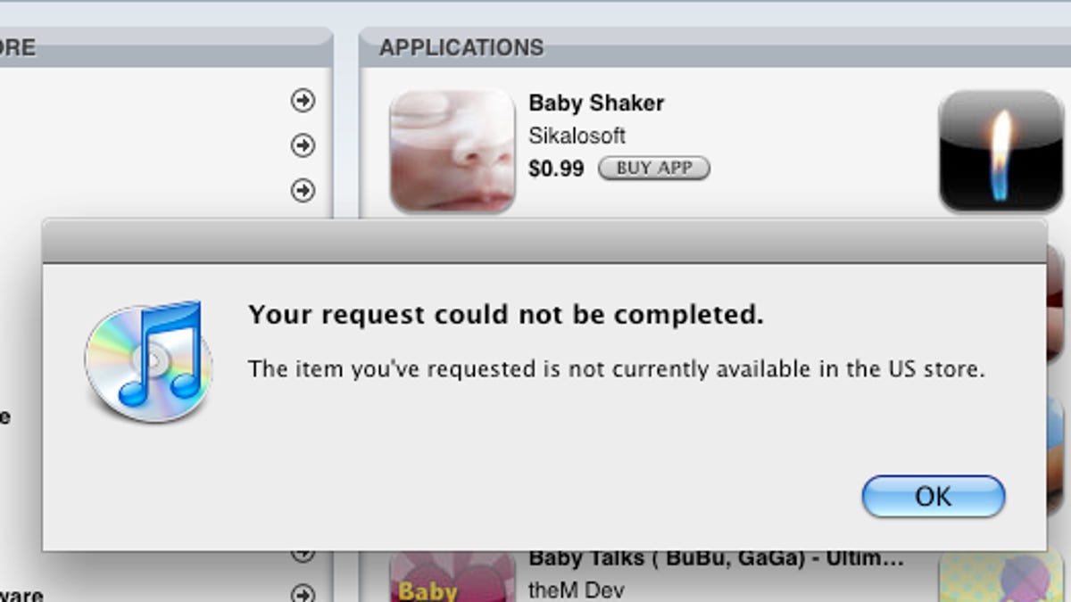 The application still shows up in the App Store search, but upon clicking on the title, an error message appears. Baby Shaker, a game in which the user is invited to silence a baby's cries by violently shaking an iPhone, appeared on the App Store Monday despite Apple's policy of banning "offensive" iPhone applications.