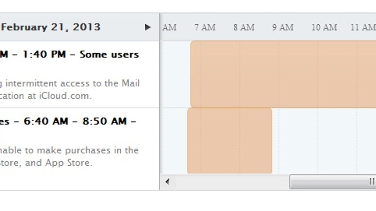 Following a series of user complaints via Twitter, Apple eventually acknowledged the problem on its system status page, which indicated outages at various times for its online stores, Mail and Contacts via iCloud, and the Calendar app across different devices.