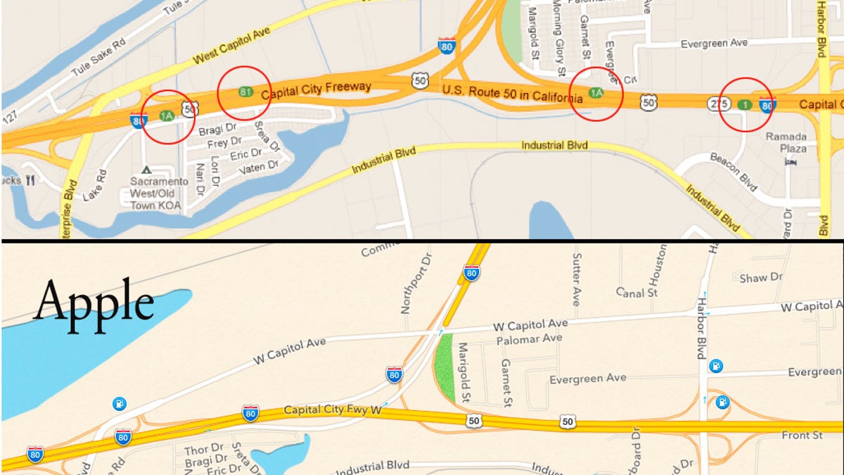 Here's a new one from the world of whacky maps brought to you courtesy of Apple. It turns out that Apple's maps in iOS 6 -- which has brought images such as this wobbly rendition of New York's Williamsburg Bridge, and this free-falling road over the Hoover Dam -- is anything but helpful when you want to get off the Interstate? Which Interstate? Well, any of the ones we looked at, from California to New Jersey. Just check out the maps above, which shows Interstate 80 and U.S. Route 50 near Sacramento. Google maps shows the exits; Apple's doesn't.