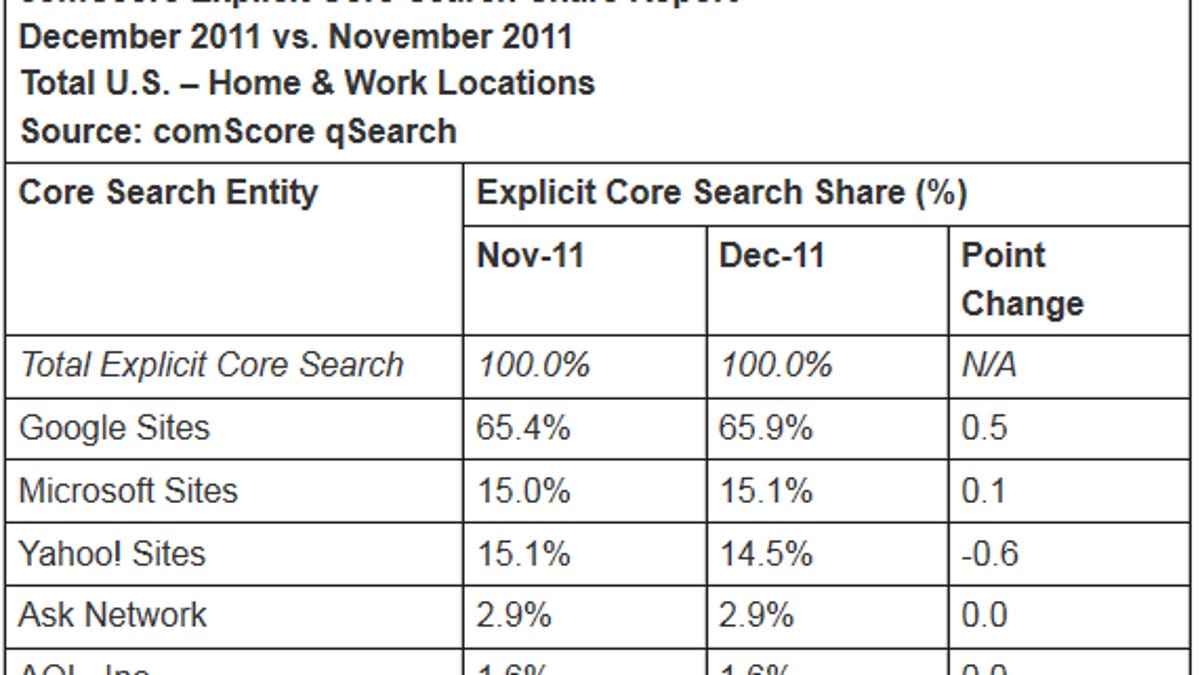 And though Google's lead has stayed firm, its share for December was slightly down from the 66 percent seen a year ago.