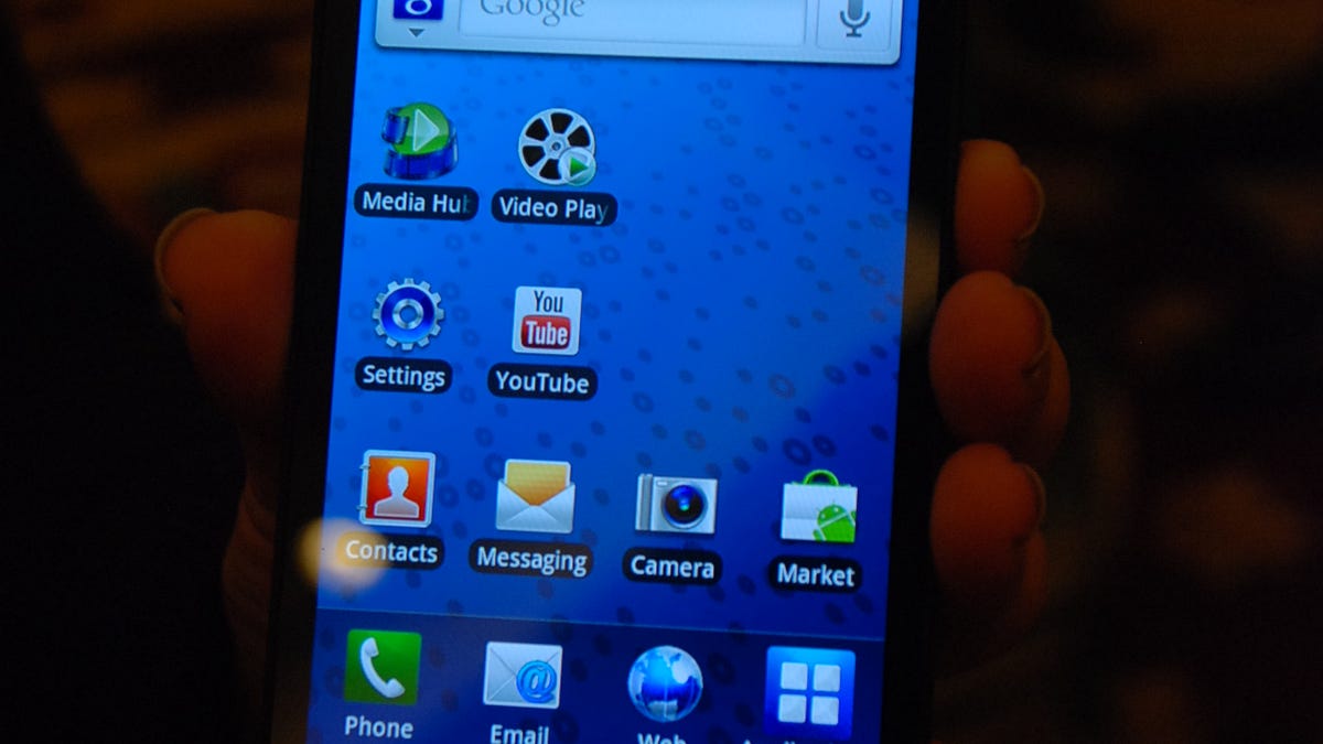 For your enjoyment, however, we will show you the one photo that we were permitted to take. It shows the bright 4.5-inch Super AMOLED display, the Android 2.2 OS, and a bit of the device's thin styling. Inside are a 1.2GHz Hummingbird processor, an 8-megapixel camera with HD video recording, and a front-facing 1.3-megapixel camera for video calls, Sadly, we didn't get the chance to take the features through their paces.