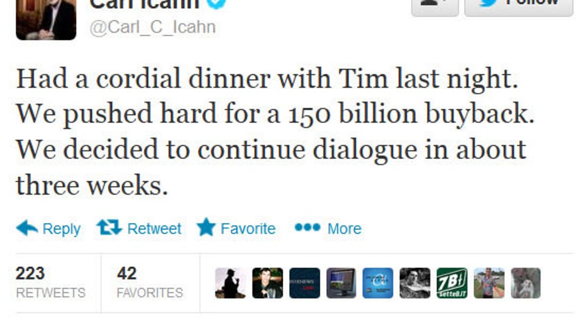 After dining with Apple's CEO, the activist investor recounted the evening in a short tweet on Tuesday: "Had a cordial dinner with Tim last night. We pushed hard for a 150 billion buyback. We decided to continue dialogue in about three weeks."