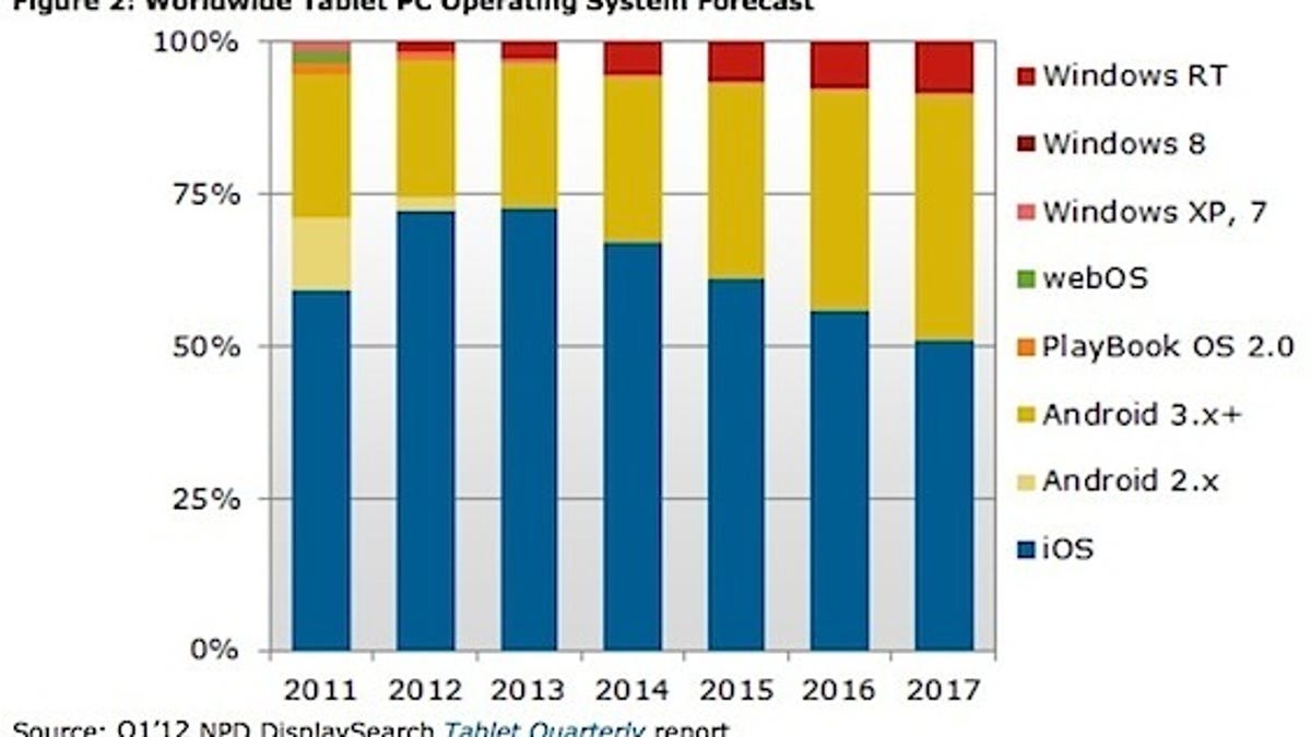 Nevertheless, iOS will eventually cede ground to others. Share will fall from 72.1 percent in 2012 to 50.9 percent in 2017, DisplaySearch said. And Android -- which is forecast at at 44 million in 2013 -- will jump from 22.5 percent to 40.5 percent over the same time period. Windows RT is forecast to have 7.5 percent of the market by 2017.
