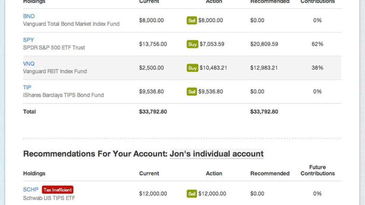 If you want personal advice, that will cost you either a per-incident or a yearly fee (up to $195 a year), but FutureAdvisor will apply its robo algorithms to all your accounts for nothing. It will tell you where you're over-invested and not, and advise you on which ETFs and funds to buy to bring your finances into balance.