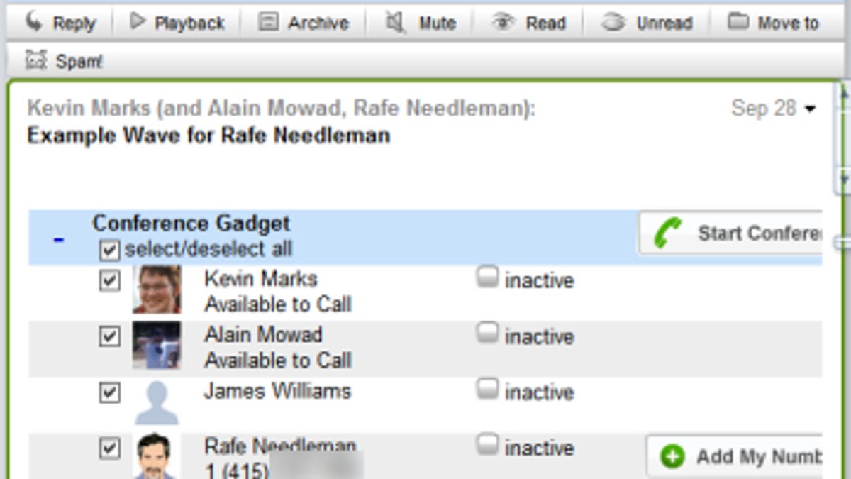 The Ribbit team recently showed me their prototype widget, which lets Wave users quickly set up a conference room inside a "wave" message on the service. Once you add the Ribbit conference widget to a wave, everyone in it becomes part of a potential voice chat. Users need to enter their phone numbers, which remain hidden from other users. Then anyone in the wave can call all the participants at once to start a conference. (Users can also call only particular people in the wave, if they wish.)