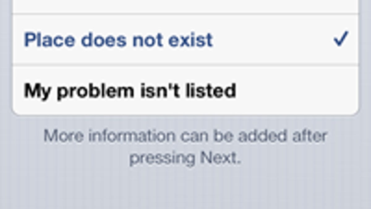 A menu pops up with four choices: Information is incorrect; Pin is at incorrect location; Place does not exist, or My problem isn't listed. Tap on the choice that best matches the problem and then tap Next. Depending on the option you chose, another screen appears asking you for further details until finally you can send your report to Apple.