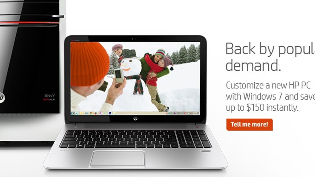 The computer maker has begun offering a handful of desktop and laptop PCs running Windows 7, touting the older operating system as "back by popular demand." To spur sales, HP is also offering the Core i5- and i7-powered machines at a $150 discount.