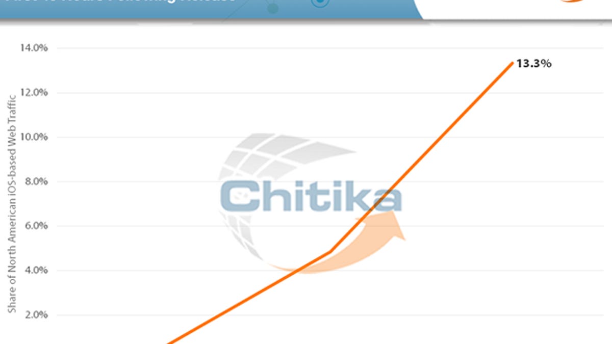 Apple's iOS 7.0.6 had captured more than 13 percent of all North American iOS traffic on the Chitika ad network just two days after its debut.