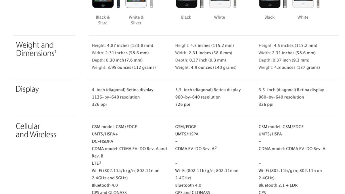 The phone will come in three different models, featuring two different kinds of wireless-access technologies -- a CDMA version and two GSM versions, according to Apple's specs page. The specs also show that the device will have to use a different SIM card than in the past as predicted by rumors and leaks.