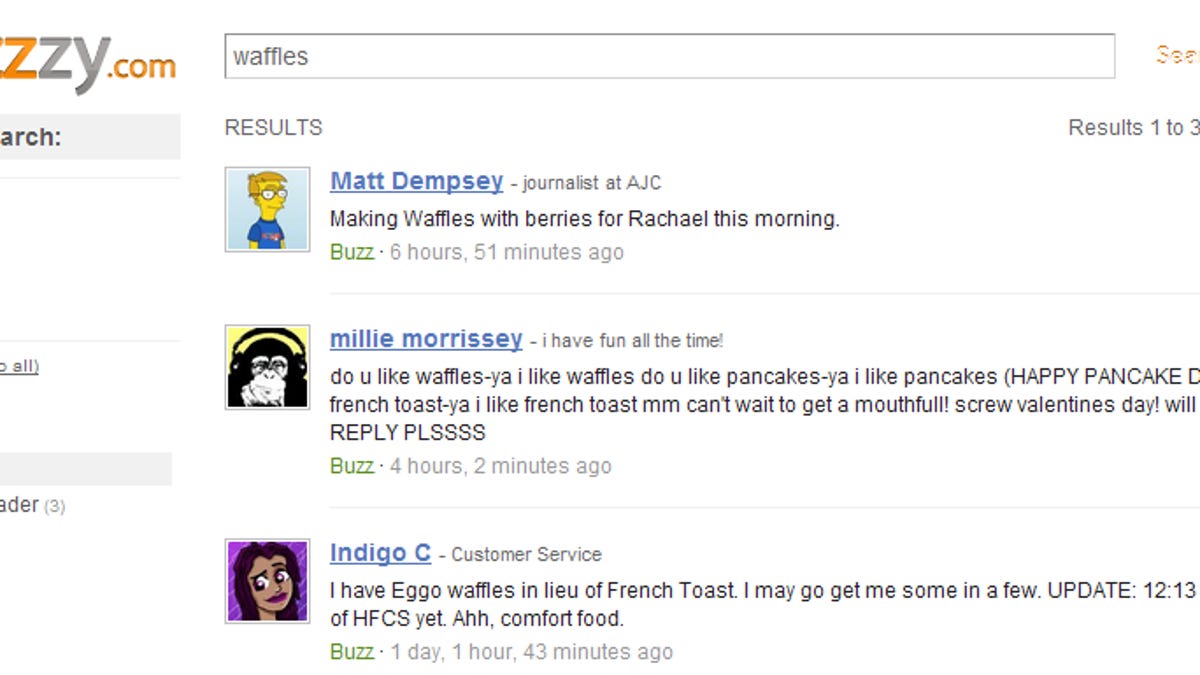 Buzzzy pulls results from Twitter and FriendFeed, as well as from numerous other sources like Google Reader, Flickr, and LiveJournal. And, unlike Buzz's own search, which orders results in a seemingly random (but probably algorithmically elegant) way, Buzzzy's search results pages put results in roughly chronological order, which makes more sense for a microblog search tool.