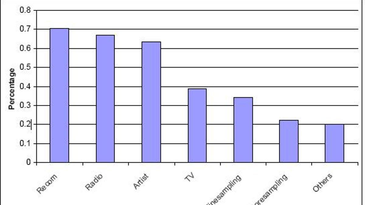 Song samples present an opportunity for iTunes and other music retailers, according to the researchers. They determined that most of their subjects discovered songs via a friend's recommendation (71 percent). That was followed by radio (67 percent), familiarity with an artist (64 percent), music TV (39 percent), and online music sampling (34 percent).