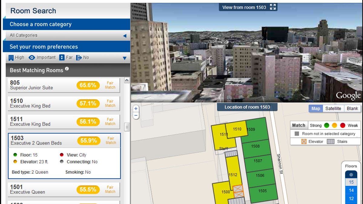 In a nutshell, the company is building a database of individual hotel rooms, including for each information like distance from elevators, what floor they're on, subjective ratings from people who have stayed in them, and--the sexy feature--a Google Maps image, with 3D buildings, of the view out the window.