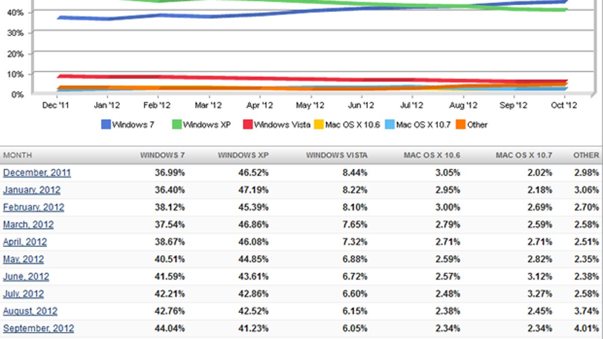 Just a year ago, XP's share was 48 percent, while Windows 7 was resting below 35 percent.