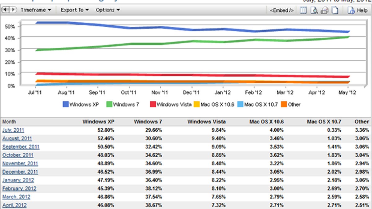 Surveying the OS landscape in May, Net Applications pegged Windows XP's market share at 44.8 percent and Windows 7's at 40.5 percent. That's the narrowest gap between the two since Windows 7 debuted in 2009. It's also a significant change from April when XP held a 46 percent share and Windows 7 a 38.8 percent share.