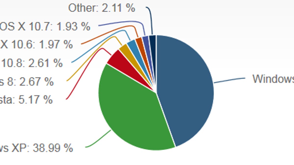 Windows 7 remained in first place though its share was virtually unchanged at 44.55 percent. In second place, Windows XP's share dipped slightly to 38.99 percent. And Windows Vista continued its gradual descent, ekeing out a 5.17 percent share.